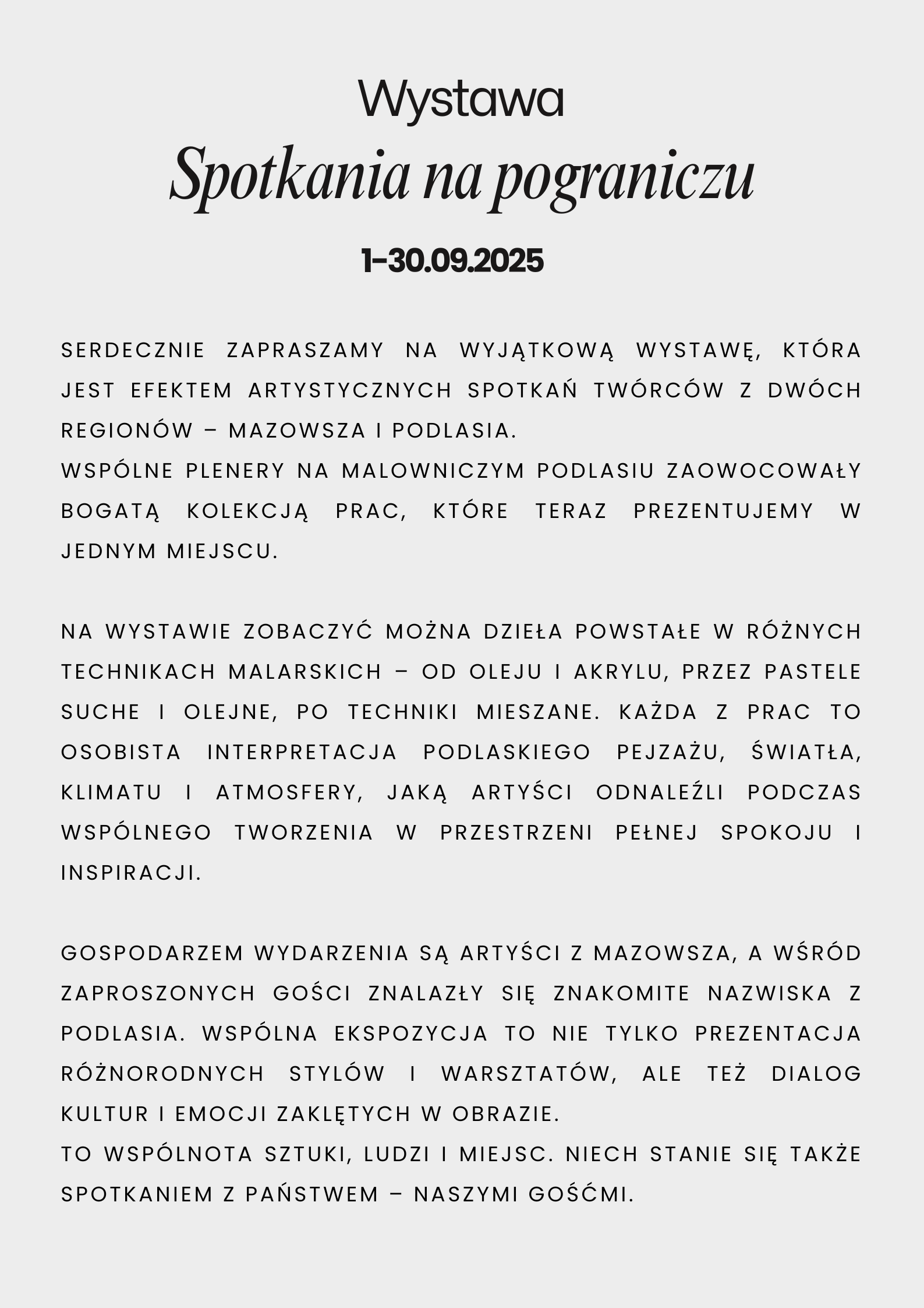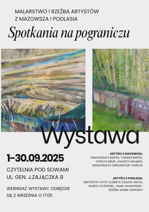 CZYTELNIA POD SOWAMI ul. Generała Zajączka 8 – zaprasza na wystawę malarstwa i rzeźby artystów z Mazowsza i Podlasia. Wernisaż wystawy dnia 2.09. 2025 r. godz. 17.00. Wystawę można oglądać od 2.09. do 30.09. 2025 r. Zapraszamy!