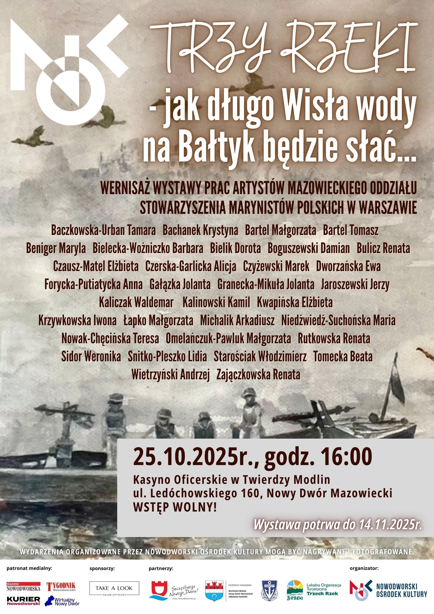 W sobotni wieczór, 25 października, w przepięknej Sali Balowej Kasyna Oficerskiego w Twierdzy Modlin, odbył się wyjątkowy wernisaż historyczno-patriotyczny „ Trzy rzeki – jak długo Wisła wody na Bałtyk będzie słać…”,prezentujący prace artystów Mazowieckiego Oddziału Stowarzyszenia Marynistów Polskich. Wydarzenie zgromadziło licznych gości z całej Polski – miłośników sztuki oraz mieszkańców regionu, którzy przyszli by wspólnie uczestniczyć w spotkaniu, w którym sztuka, historia i pamięć patriotyczna splatały się ze sobą w niezwykły sposób.